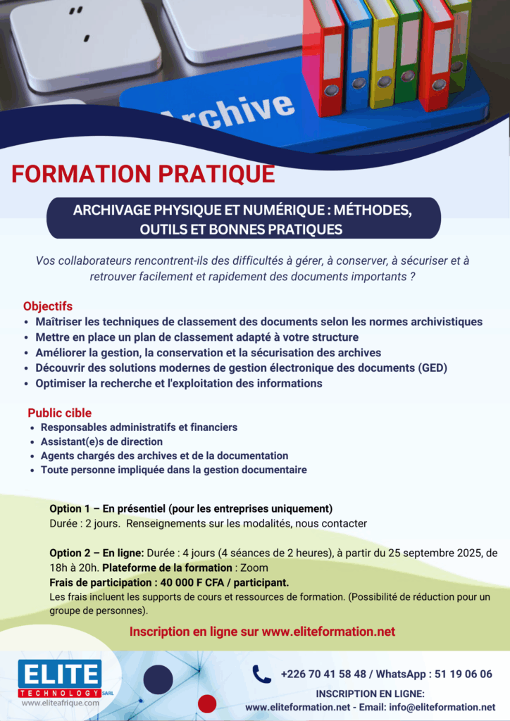 Téléphone : +226 70 41 58 48 / WhatsApp : +226 51 19 06 06 Email : info@eliteformation.net site web : www.eliteformation.net. Inscrivez-vous directement en cliquant sur « Je m’inscris à cette formation » ci-dessous